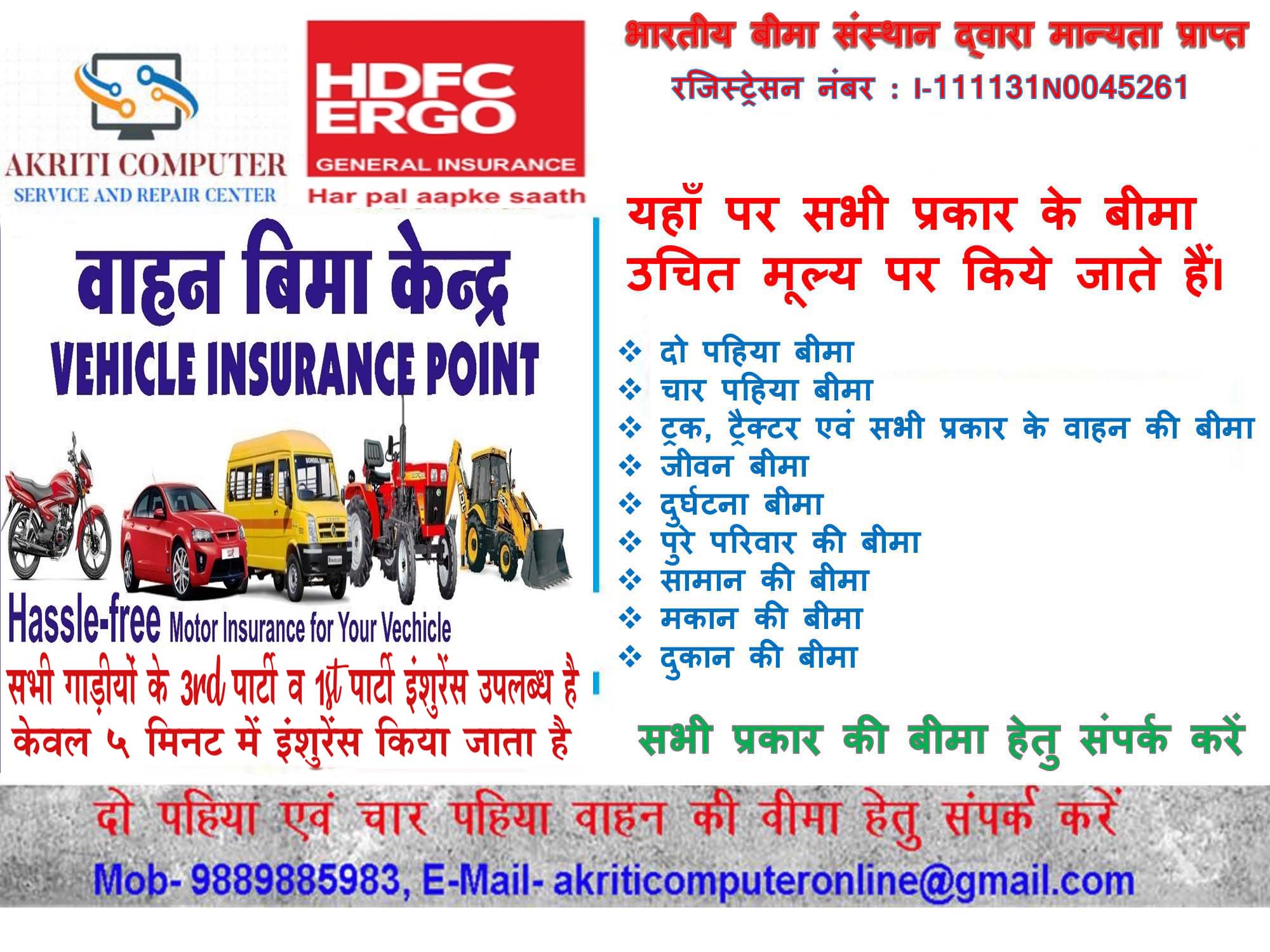 * आकृति कम्प्यूटर भारतीय बीमा संस्थान द्वारा मान्यता प्राप्त संस्था हैं, जिसकी रजिस्ट्रेसन संख्या I-111131N0045261 हैं. आकृति कंप्यूटर में सभी प्रकार की जनरल इंश्योरेंस की सुबिधा उपलब्ध हैं. यहाँ पर दो पहिया वाहन, चार पहिया वाहन, ट्रक, ट्रैक्टर, सभी प्रकार के वाहन की बीमा, सामान की बीमा, दुकान की बीमा, जीवन बीमा, दुर्घटना बीमा, पुरे परिवार की बीमा इत्यादि सेवाएँ उचित मूल्य पर उपलब्ध हैं।