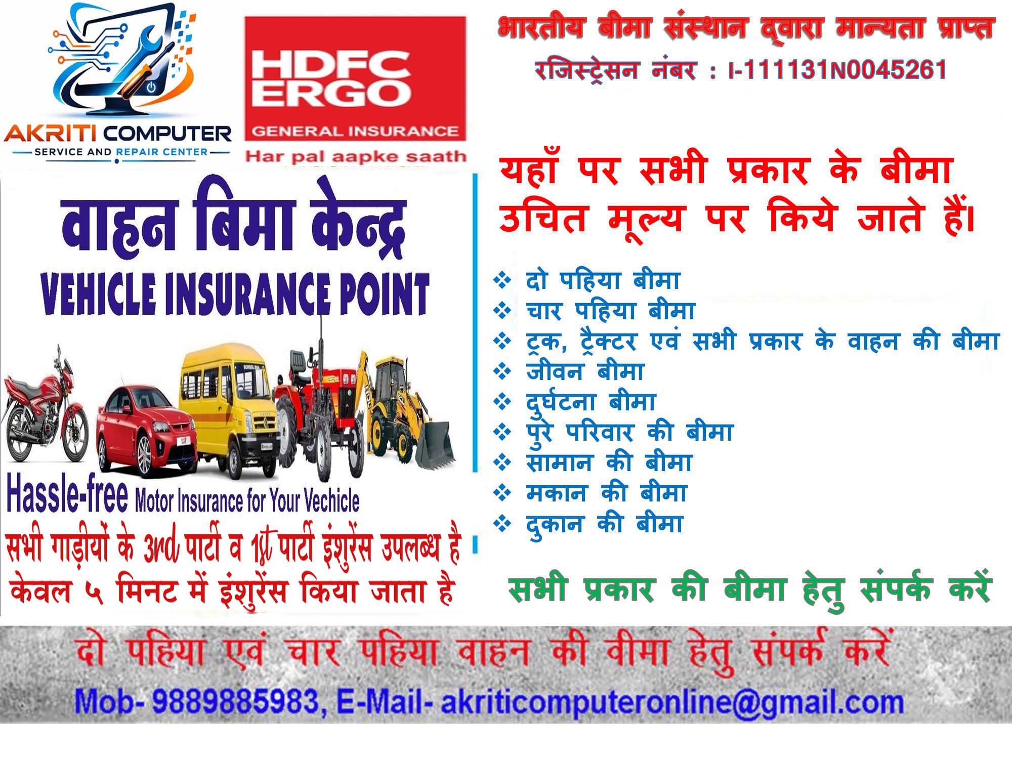 * आकृति कम्प्यूटर भारतीय बीमा संस्थान द्वारा मान्यता प्राप्त संस्था हैं, जिसकी रजिस्ट्रेसन संख्या I-111131N0045261 हैं. आकृति कंप्यूटर में सभी प्रकार की जनरल इंश्योरेंस की सुबिधा उपलब्ध हैं. यहाँ पर दो पहिया वाहन, चार पहिया वाहन, ट्रक, ट्रैक्टर, सभी प्रकार के वाहन की बीमा, सामान की बीमा, दुकान की बीमा, जीवन बीमा, दुर्घटना बीमा, पुरे परिवार की बीमा इत्यादि सेवाएँ उचित मूल्य पर उपलब्ध हैं।
